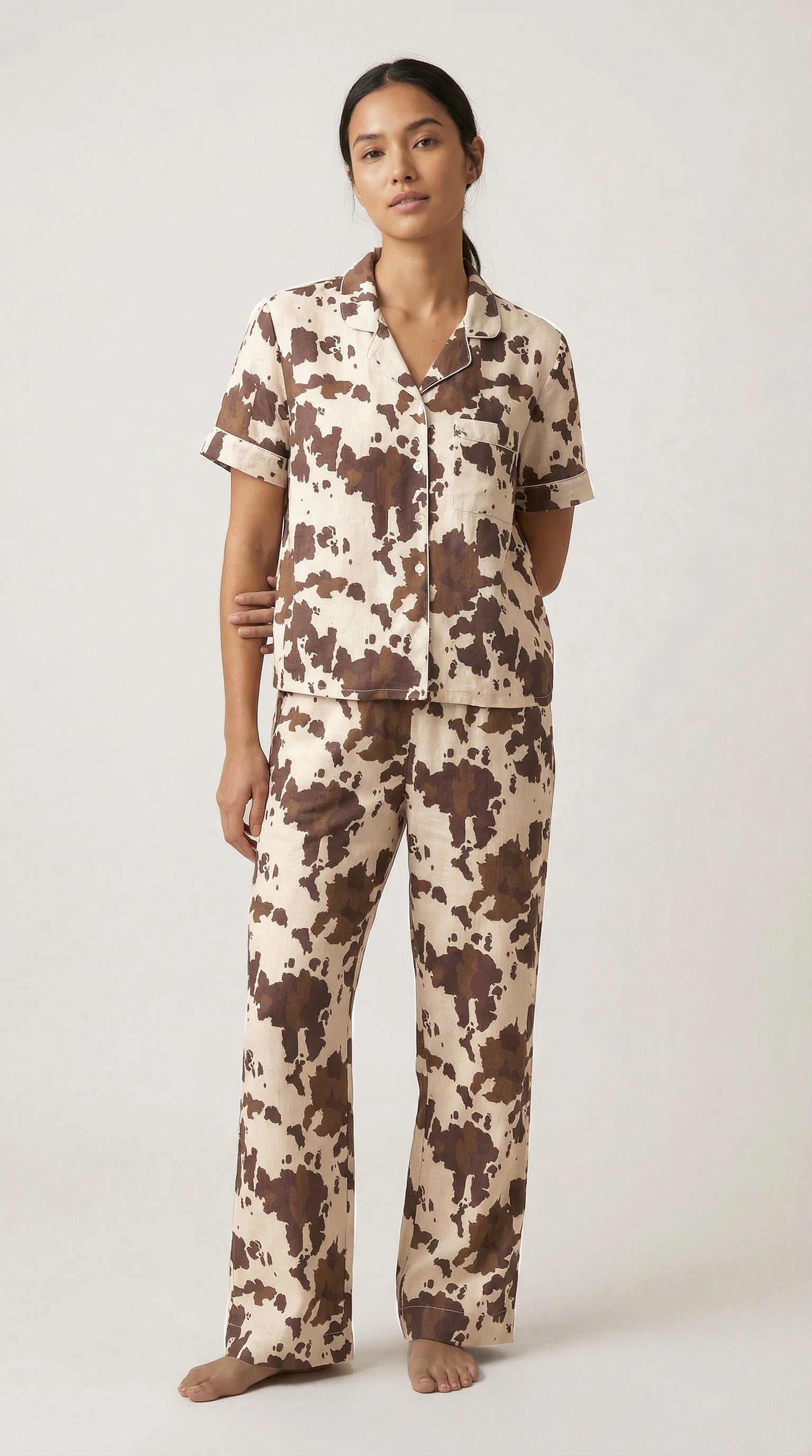 Pijama de mangas cortas con botones y pantalón, con resorte cómodo y suave, el pantalón tiene bolsillos laterales y tiro amplio para mayor comodidad.